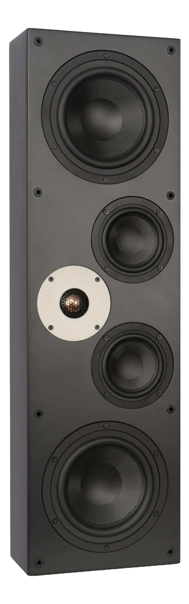The E-IW62 combines cinema-grade dynamics and installation flexibility in a 3-way sealed format. Dual 6.5" woofers and dual 4" mids deliver high-impact sound, while the 1" tweeter ensures crisp, intelligible highs—even behind screens. Internal driver isolation and a 117 mm depth make it perfect for LCR use in shallow baffle walls or on-wall setups.