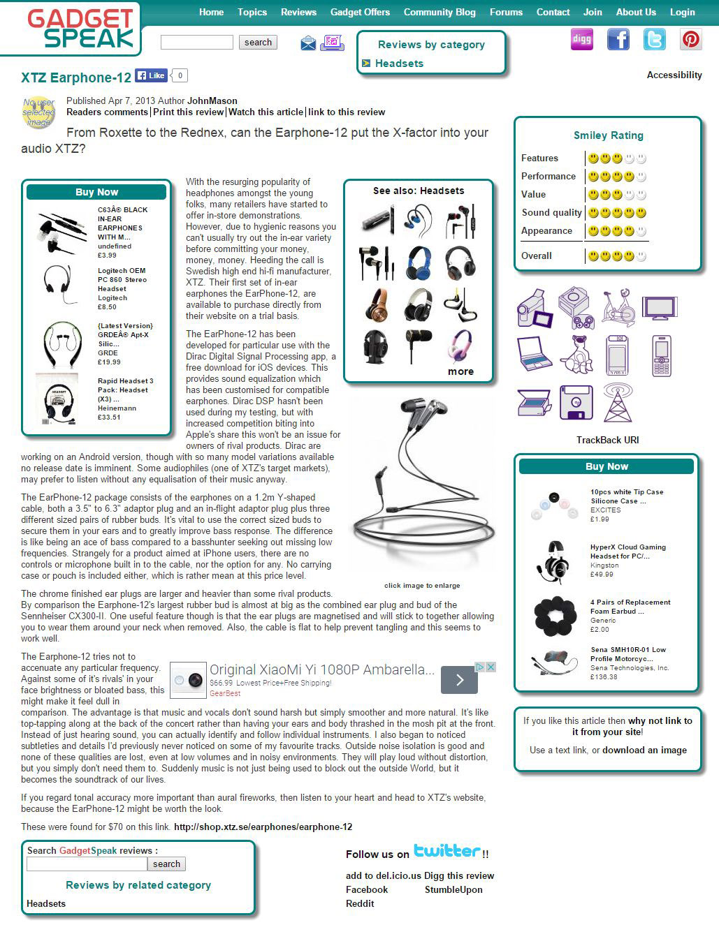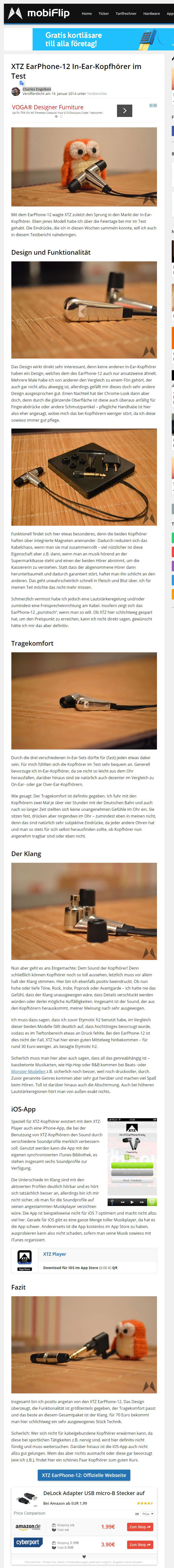 I am positively impressed by the XTZ EarPhone-12th The design convinced the functionality is largely given the comfort fit and the best thing about this package is the sound. for 70 euros you get here is simply a very balanced piece of technology. - Charles Engelken mobiflip