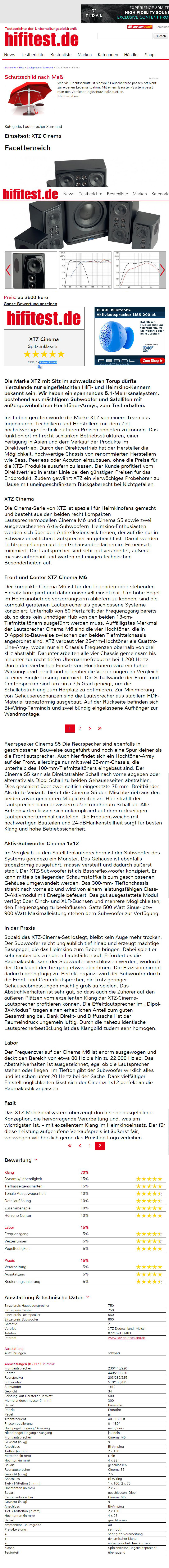 Score: 5/5 The XTZ multichannel system convinced by its unusual design excellent workmanship and most importantly - excellent sound in a home cinema environment. The asked selling price is extremely fair which is why we want to give our Preistipp logo. - Jochen Schmitt hifitest.de