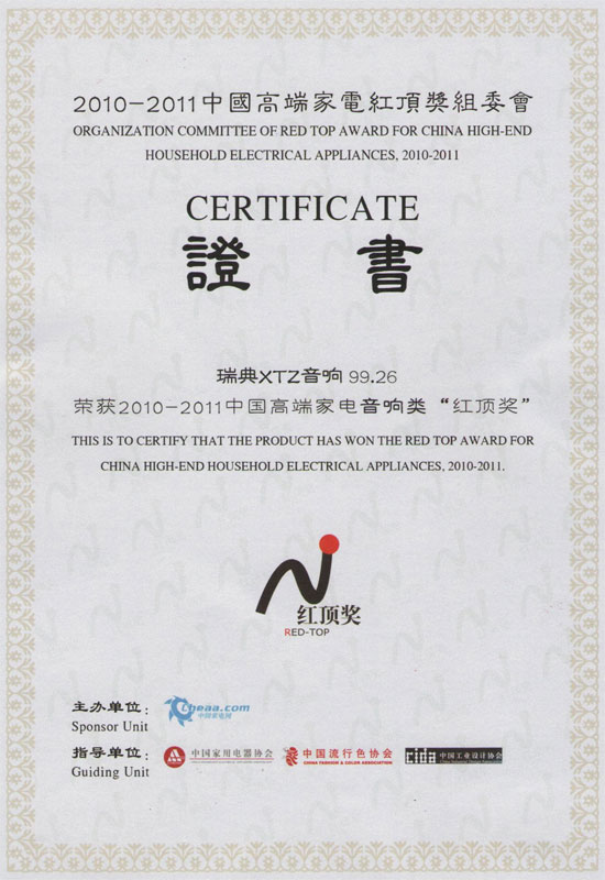 This is to certify that the product has won the red top award for china high-end household electrical appliances 20102011.