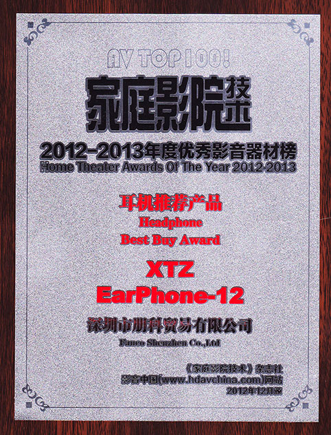 Earphone-12 creates clearly wider range of sound in middle frequency and better performance in cohesion of sound and provides more information and give more smooth and soft sound. And also it sounds not stiff but widened much at once. It shows unprecedented performance on sound details and texture the voice thickness is not only moderate but also full of vigor... - Wenfeng Home Theatre Technology
