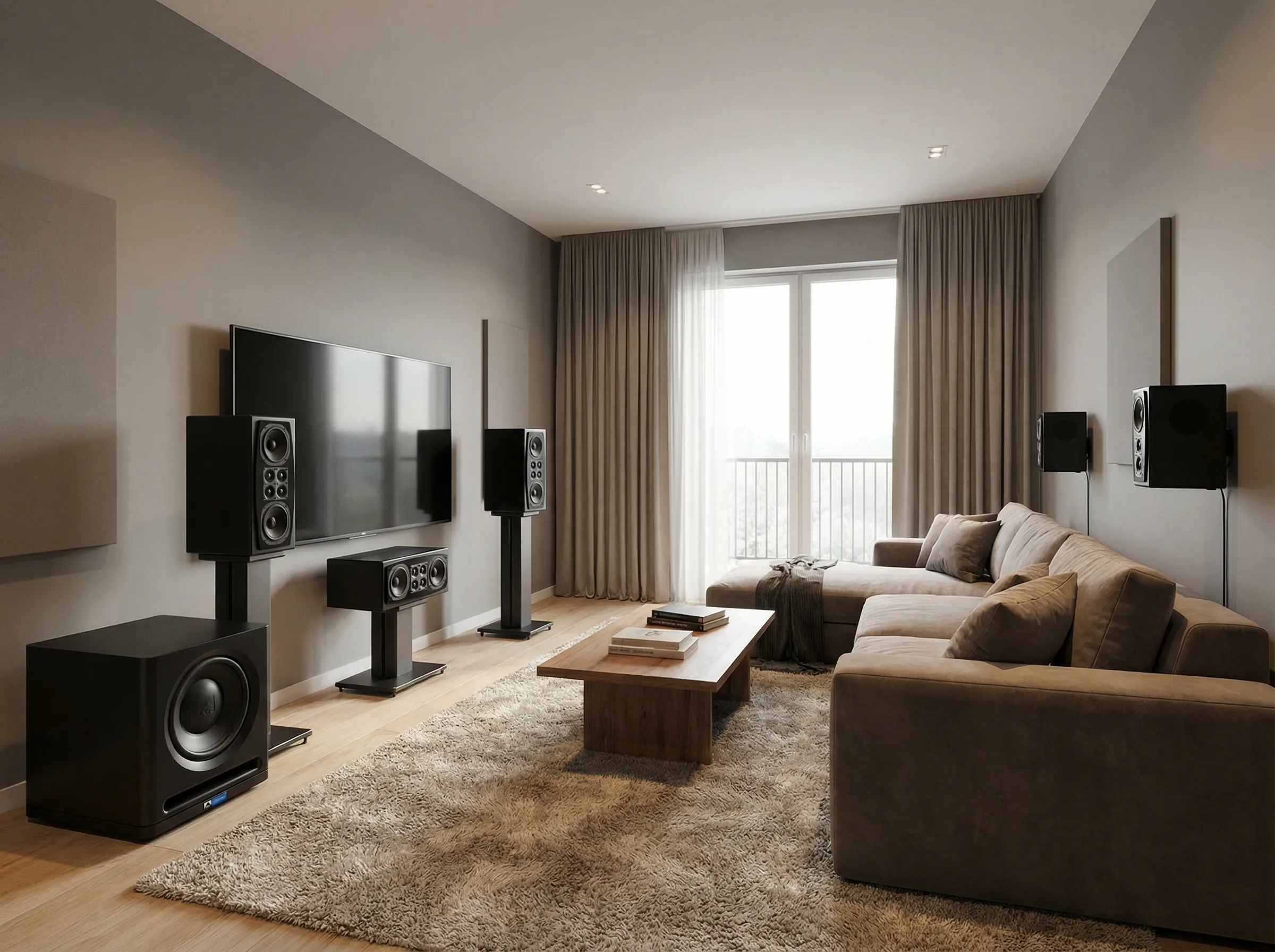 Designed to vanish visually in cinema rooms with a low-reflection black or white finish.