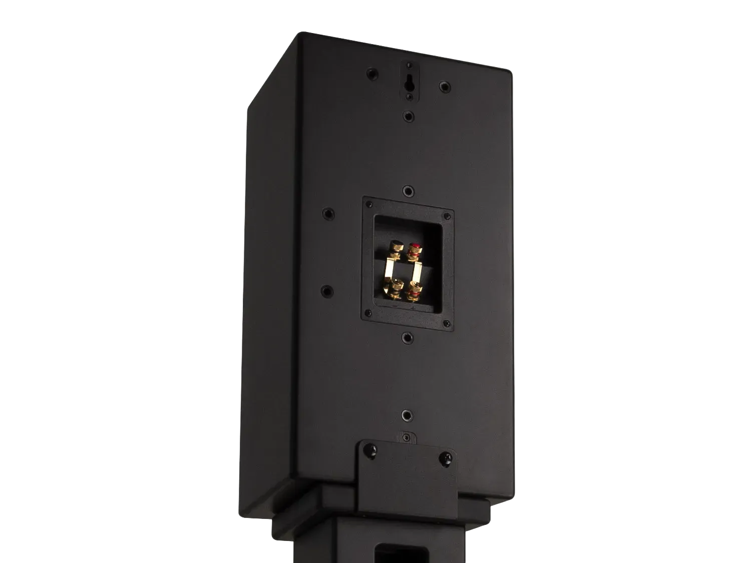 The cabinet uses thick High Density Fiberboard (HDF) and internal bracing for rigidity and low resonance. Its trapezoidal form reduces internal standing waves, and a low reflection matte finish blends discreetly into dark rooms.
