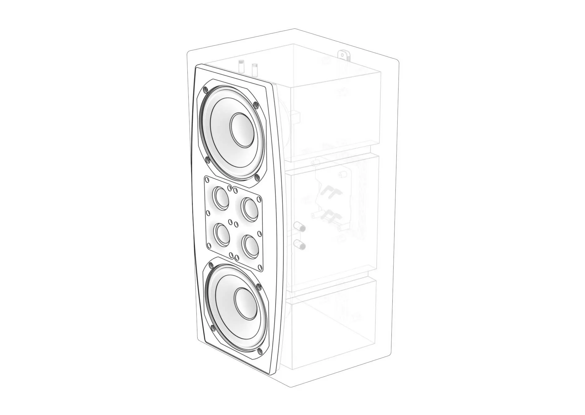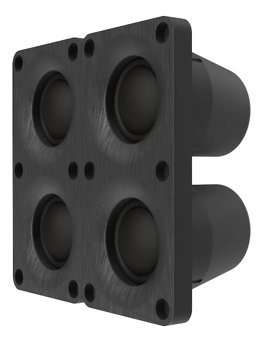 The Quad Tweeter Array offers controlled directivity across the horizontal axis without creating a narrow beam. It reduces early reflections from side walls and limits floor and ceiling reflections, maintaining clarity and focus even at high playback levels.