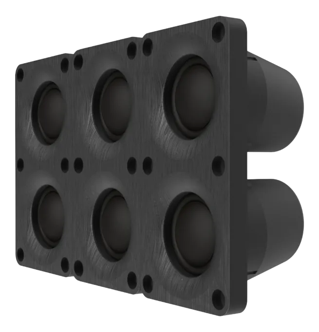 At the heart of the Cinema M8 Tower is a custom-developed Hex Tweeter Array, consisting of six 1" silk-dome tweeters. Five are optimized for the critical midrange region, and one handles treble extension. This layout delivers high output, low distortion, and controlled dispersion—ideal for immersive, room-filling sound.
